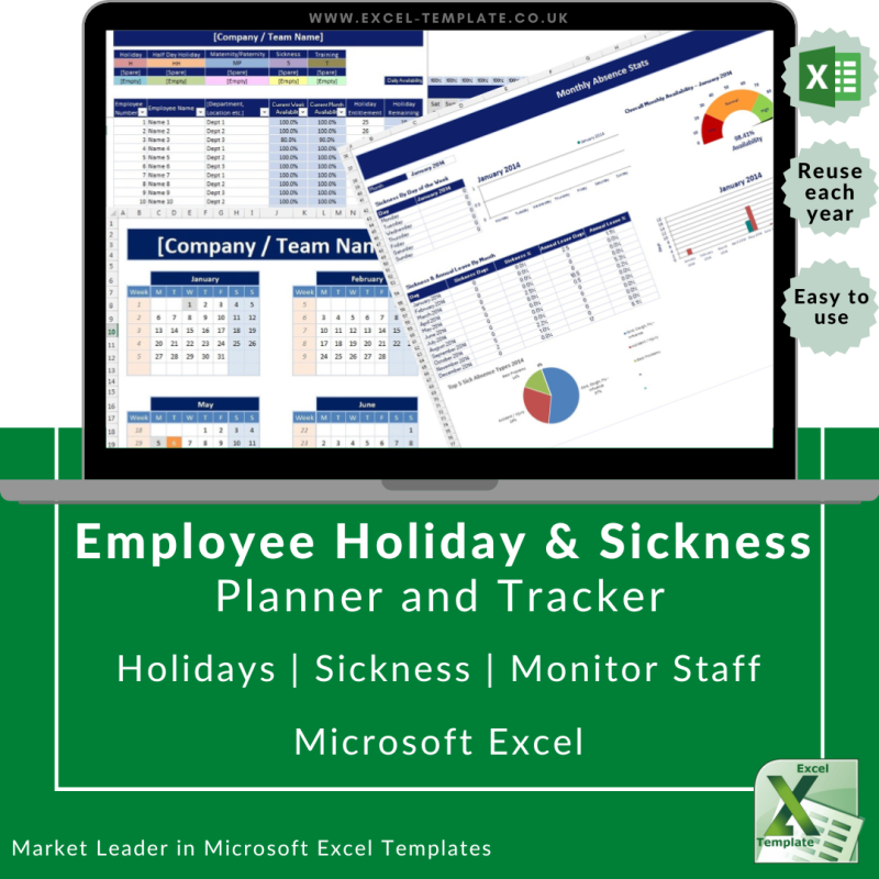Excel Spreadsheet Employee, Staff Holiday & Sickness Planner, Calendar reusable